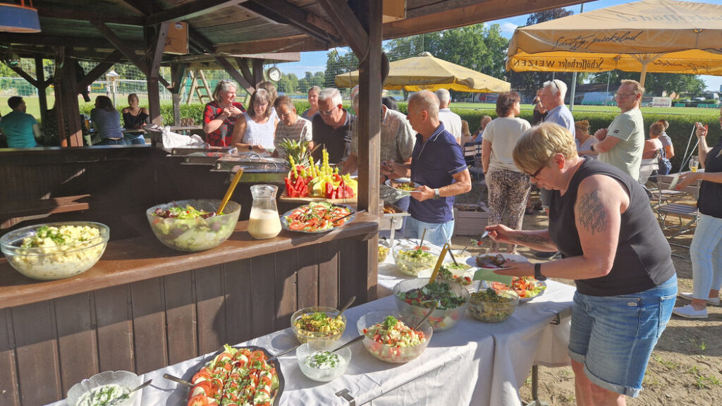 Den kulinarischen Rahmen bildete das Grillbuffet. Es ließ kaum Wünsche offen und bot eine vielfältige Auswahl. Zunächst! Denn nur, wenn man die Gunst der Stunde erkannt und sich rechtzeitig zum Buffet aufgemacht hatte, konnte der Teller befüllt werden.