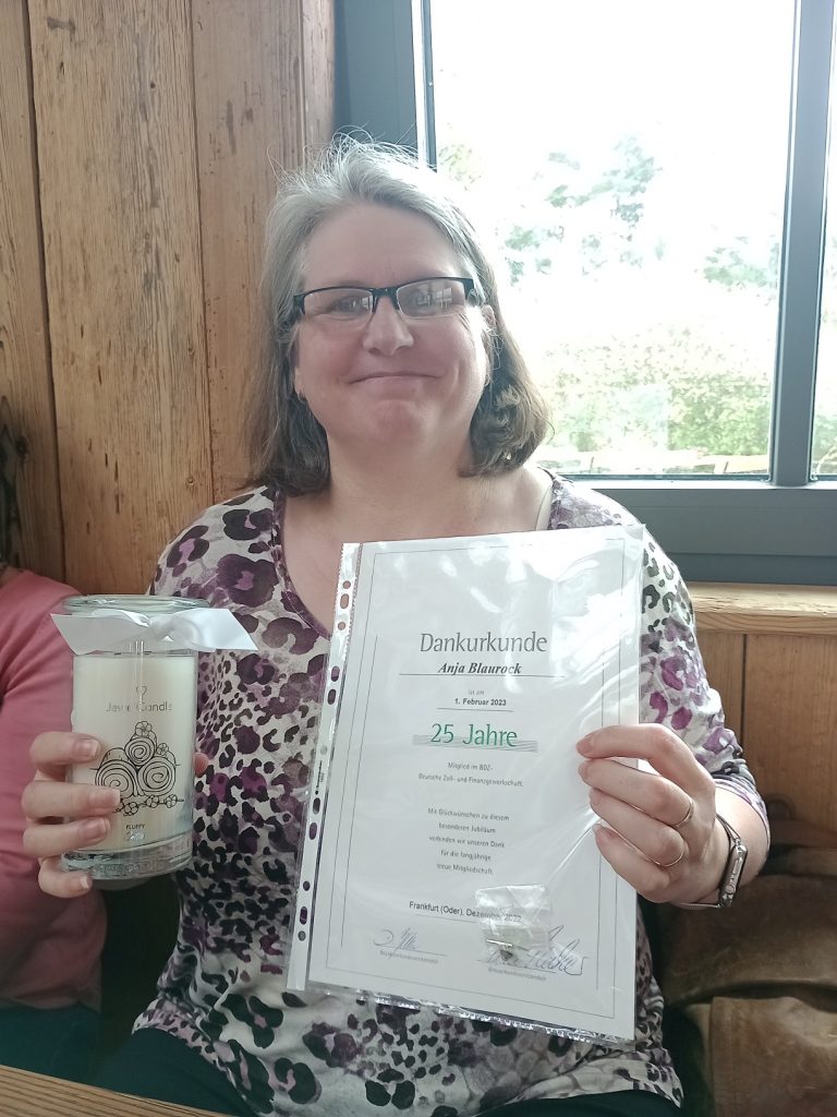 Auf der Mitgliederversammlung gab es auch in diesem Jahr wieder einen freudigen Anlass, so konnte die Kollegin Anja Blaurock für ihre 25-jährige Mitgliedschaft im BDZ geehrt werden – herzlichen Glückwunsch. In geselliger Runde konnte der Abend nach dem offiziellen Teil zu einem schönen Abschluss gebracht werden.