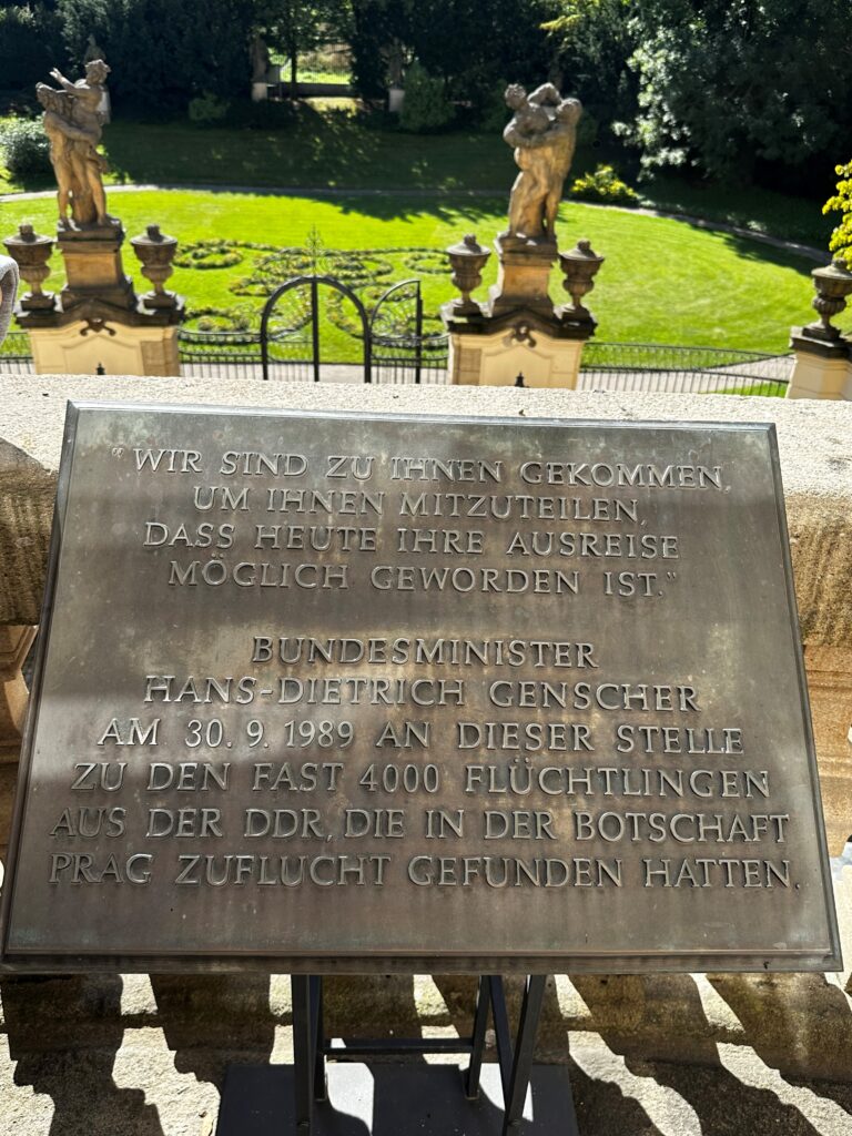 Besonders geprägt hat hier die deutsche Geschichte, als im Sommer 1989 rund 4000 Menschen der ehemaligen DDR Zuflucht in dieser Botschaft suchten. Wir standen auf dem Balkon, von dem Hans Dietrich Genscher damals verkündete: „Wir sind gekommen, um Ihnen mitzuteilen, dass heute Ihre Ausreise …“ – zumindest jeder der TeilnehmerInnen, der diese Zeiten miterlebte, hatte den Jubel der Menschen im Ohr, so dass der Rest des Satzes nicht mehr zu hören war. Das war für viele von uns ein Gänsehautmoment.