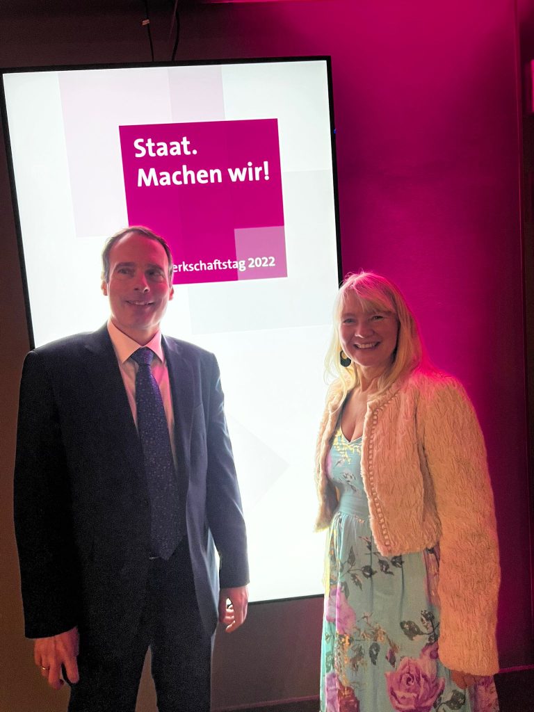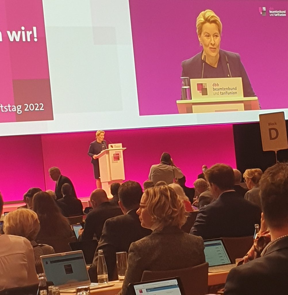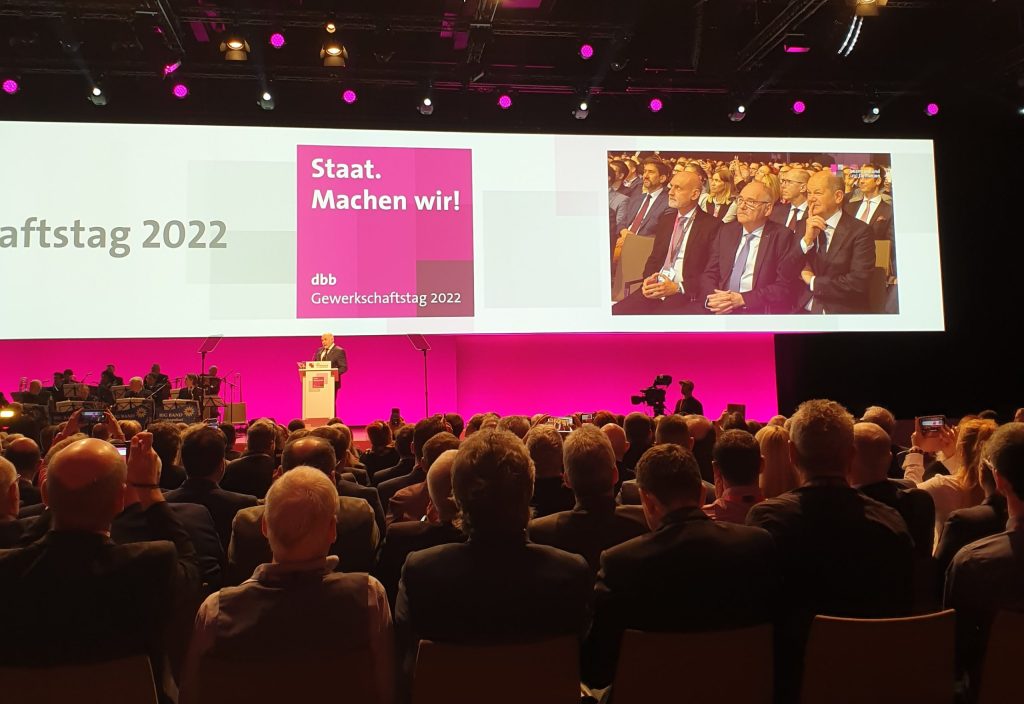 Ulrich Silberbach dankte den vielen Kolleginnen und Kollegen, die sich ehrenamtlich neben ihrem Dienst dafür einsetzen, die Arbeitsbedingungen für alle zu verbessern. Bundeskanzler Olaf Scholz hob in seinem Grußwort die Bedeutung des öffentlichen Dienstes hervor und dankte den Beschäftigten – sie seien „die Gestalter der Zeitenwende“. Sie betreffe in ihren Auswirkungen sämtliche Bereiche des öffentlichen Dienstes, wo die Beschäftigten neben den „normalen“ Aufgaben unter Hochdruck an der Unterstützung für Geflüchtete, der Abfederung von Härten durch Inflation und Energiepreisexplosion und der Umsetzung der Energiewende arbeiteten. Er betonte: „Staat machen Sie, und das sehr gut. Und dafür danke ich Ihnen von ganzem Herzen.“