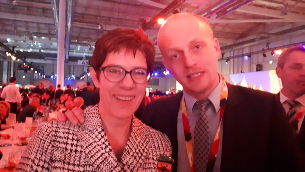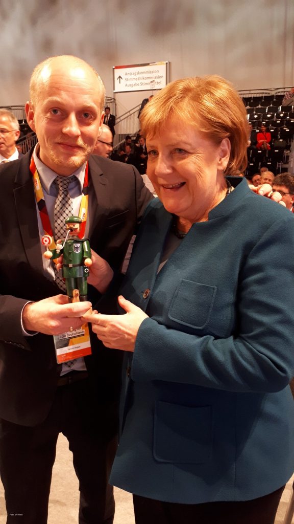 So habe ich im Rahmen des 31. CDU-Parteitages, am 07.12.2018 in Hamburg der neuen Vorsitzenden der CDU Deutschland, Annegret Kramp-Karrenbauer (AKK), als Begrüßungsgeschenk und der ehemaligen Vorsitzenden und derzeitigen Bundeskanzlerin Angela Merkel im Namen des BDZ ein Zollräuchermännchen überreicht. Frau Merkel war sichtlich erfreut über das Geschenk und nahm das Räuchermännchen sofort mit zu ihrem Platz. Beide waren auffallend demütig und bescheiden sowie außerordentlich nett im Gespräch.