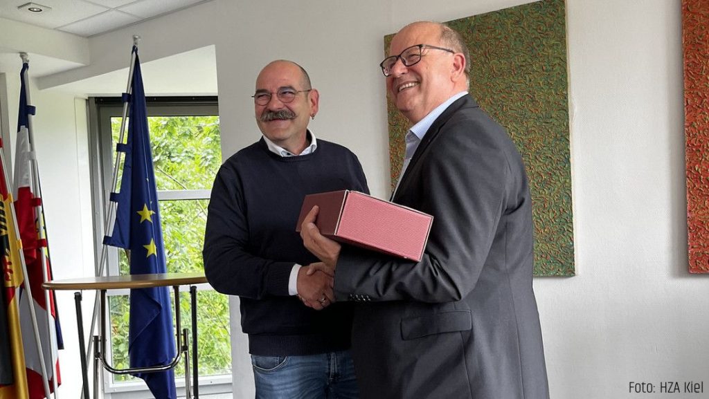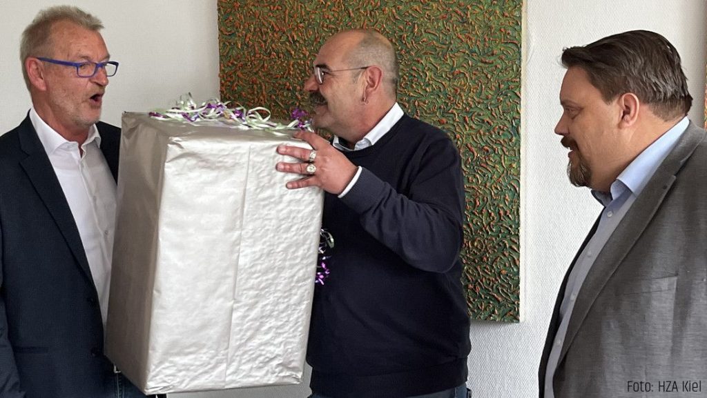 Der Vorsitzende des BDZ- Ortsverbandes Kiel Miguel Garcia verabschiedete beide Kollegen mit einem kleinen Geschenk und den Worten: „Zwei Legenden verlassen heute den Raum“ und dem Dank für ihre langjährige Arbeit zum Wohle der Beschäftigten beim Hauptzollamt Kiel.