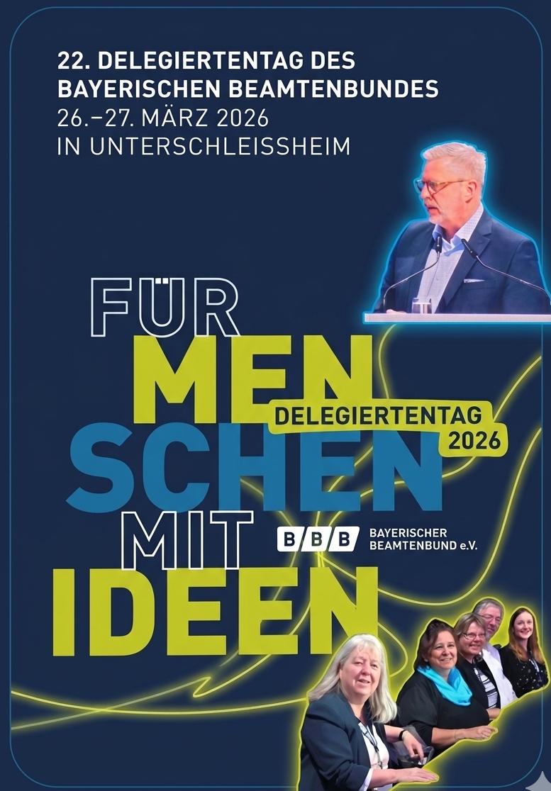 Der Delegiertentag des Bayerischen Beamtenbundes (BBB), das höchste Gremium des BBB, wird im 5-Jahres-Rhythmus ausgetragen. In diesem Jahr fand er vom 26. bis 27. März 2026 in Unterschleißheim statt.