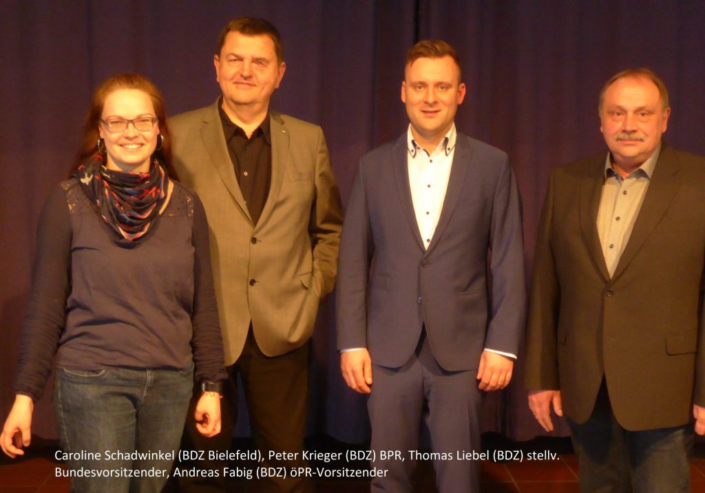 Der Personalrat beim Hauptzollamt Bielefeld hat am 04. April 2019 zur Personalversammlung in den Ravensberger Park in Bielefeld eingeladen. Der öPR-Vorsitzende, Andreas Fabig (BDZ), eröffnete am Vormittag die Versammlung und legte den Tätigkeitsbericht vor. Anschließend richteten ORR Thomas Adebar als Vertreter der Leitung des Hauptzollamts, Frau Dr. Berger als Vertreterin der GZD, Thomas Liebel (Stellv. BDZ Bundesvorsitzender) und Peter Krieger (BDZ) als Vertreter des Bezirkspersonalrates Grußworte an die anwesenden Kolleginnen und Kollegen.