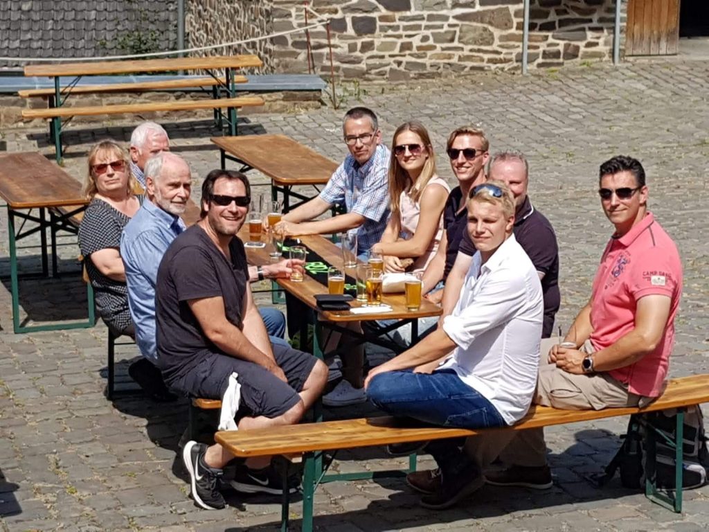 Nach diesen interessanten Einblicken in das Schmiedehandwerk und dem Weg durchs Tal waren alle Ausflüglerinnen und Ausflügler hungrig und durstig. So machten es sich die begeisterten Teilnehmerinnen und Teilnehmer bei Schmalzstullen und Torte gemütlich und genossen dazu das nach alter Sitte vor Ort gebraute Mäckinger Bier.