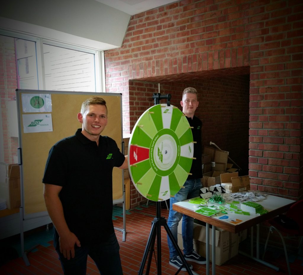 Als Kompetenzteam für die örtliche Betreuung der Nachwuchskräfte am Ausbildungsstandort Münster standen hierbei Franziska Mertens (BDZ Bezirksverband Westfalen), Malvin Wrobe (BDZ Bezirksverband Westfalen), Marcel Borrmann (Bezirksjugendleiter im BDZ Bezirksverband Westfalen), Stefan Walter (Bezirksverbandsvorsitzender BDZ Bezirksverband Westfalen) und Sebastian Teßmer (Stellv. Bezirksverbandsvorsitzender) den Studierenden des diesjährigen Grundstudiums bzw. des Hauptstudiums I (einschließlich des Studiengangs V-IT) und den Anwärterinnen und Anwärtern des mittleren Dienstes für deren offene Fragen rund um die Fachgewerkschaft BDZ zur Verfügung. An dem sehr gut besuchten Infostand konnte das Team die zahlreichen Fragen der Nachwuchskräfte ausgiebig beantworten und hatte das ein oder andere „give-away“ parat, welches von den Anwärterinnen und Anwärtern dankend angenommen wurde. Auch präsentierte sich der BDZ hier mit einem Glückrad und hatte neben einem tollen Hauptpreis auch noch „Trostpreise“ für alle Teilnehmerinnen und Teilnehmer zu vergeben.