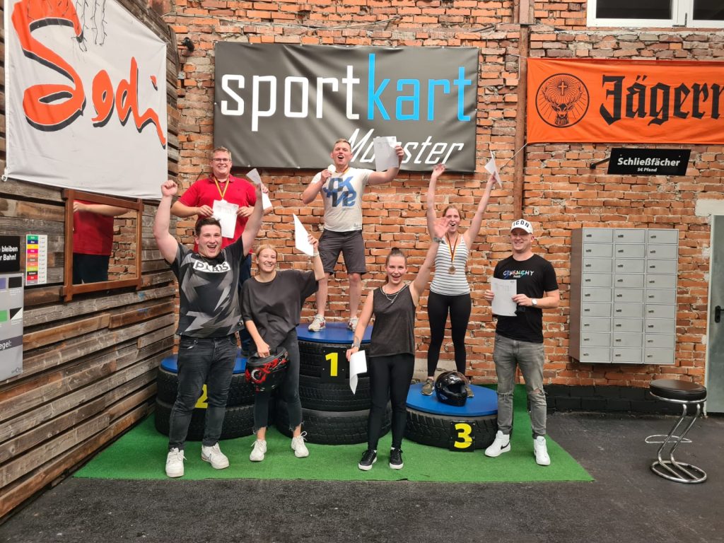 Die Einladung von Marcel Borrmann ins Sportkart Münster war an alle Anwärterinnen und Anwärter, Auszubildende sowie junge Kolleginnen und Kollegen gerichtet. Nachdem die Einweisung in die Karts, die verschiedenen Regeln und Bedeutung der Streckenflaggen erfolgte, begann das Rennen mit vierzig Rennrunden auf der 500m langen Rennstrecke. Am Ende standen die Siegerehrungen für Platz 1 bis 3 an. Aber wie immer hieß es auch diesmal, dabei sein ist alles. Hauptsache es hat Spaß gemacht und das Treffen war eine gelungene Abwechslung.