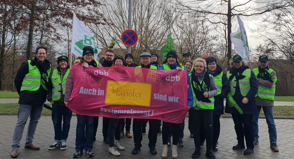 Zu der Protestaktion haben der dbb und der Vorsitzende des BDZ Ortsverbands Münster, Matthias Westphal, aufgerufen. Rund 25 BDZ-Mitglieder zeigten in einer aktiven, gewerkschaftlichen Mittagspause die Bereitschaft, sich für die berechtigten Forderungen des dbb in der aktuellen Einkommensrunde bei Bund und Kommunen einzusetzen.