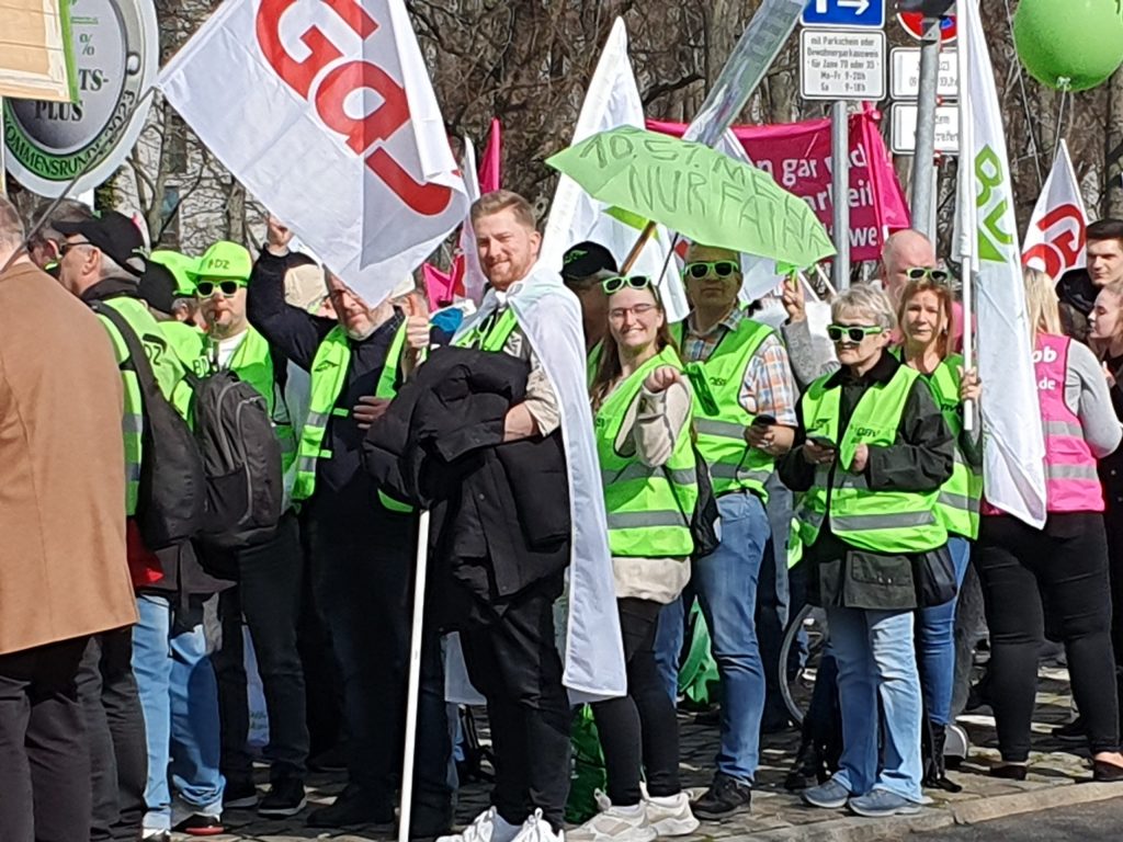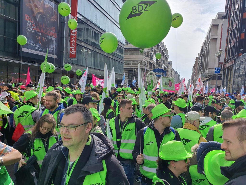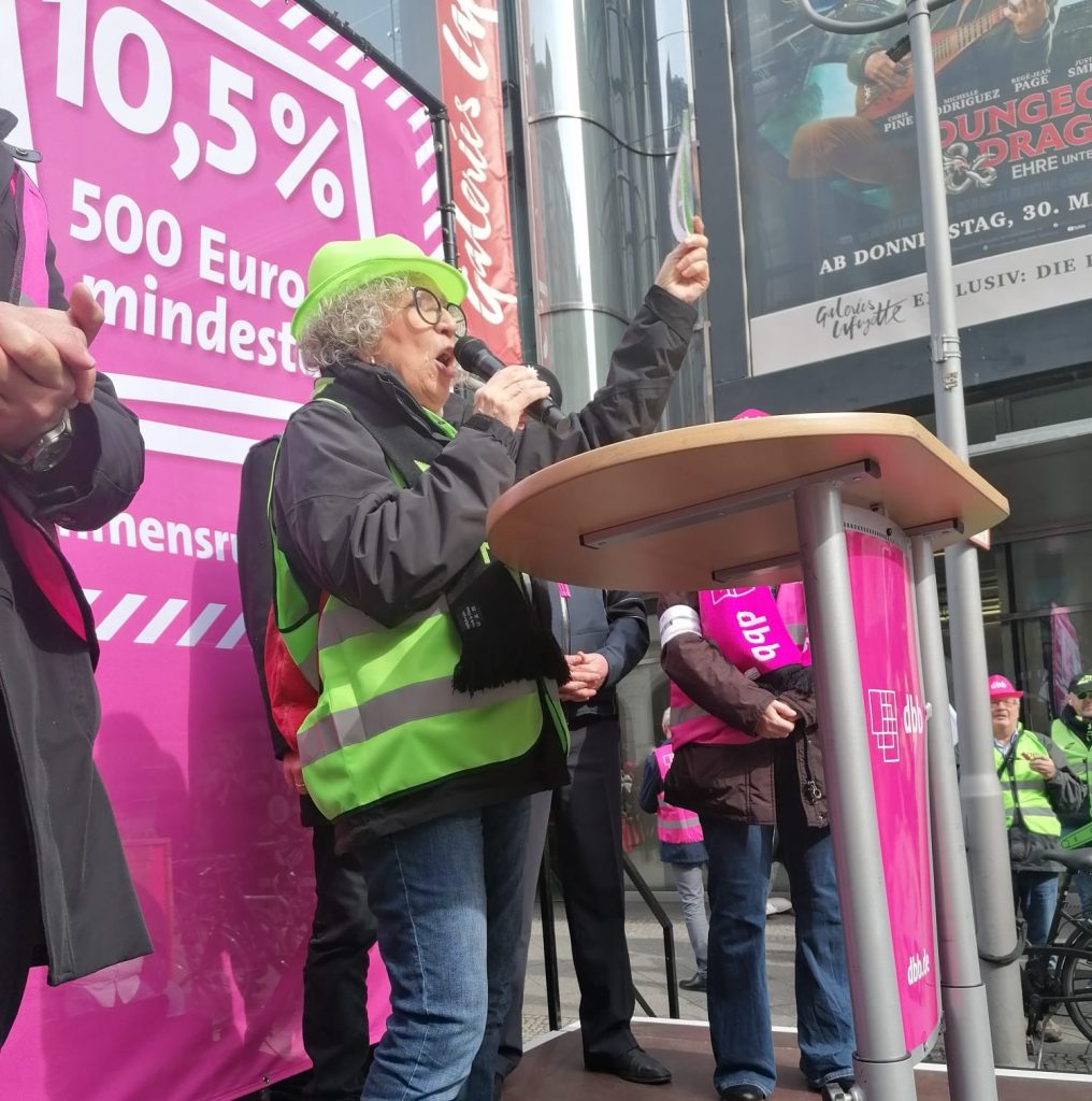 Insgesamt waren über 2000 Beschäftigte aus den verschiedenen dbb Mitgliedsgewerkschaften in Berlin und sind für eine gerechte und angemessene Bezahlung auf die Straße gegangen. Die Großdemo startete in der Friedrichstraße vor dem dbb-forum mit einer Auftaktkundgebung. Hier machte die stellvertretende BDZ-Bundesvorsitzende, Adelheid Tegeler, deutlich, dass in der 3. Verhandlungsrunde ein verhandlungsfähiges Angebot der Arbeitgeber erfolgen muss. Die Beschäftigten im öffentlichen Dienst verlangen einen der Inflation angemessenen Tarifabschluss von 10,5%, mindestens 500 Euro, und eine zeit- und inhaltsgleiche Übernahme für unsere Beamtinnen und Beamten und Versorgungsempfängerinnen und Versorgungsempfänger.