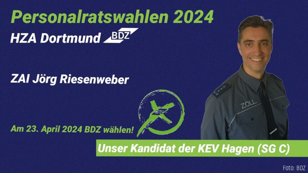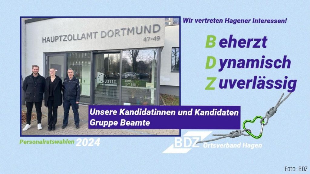 Beherzt, dynamisch und zuverlässig möchten wir die Hagener, Lüdenscheider und Siegener Interessen im örtlichen Personalrat beim HZA Dortmund vertreten. Ihr habt es in der Hand, dass die Belange der beiden großen Standorte Hagen (Zollamt, KEV und FKS) und Siegen (Zollamt, SG B und FKS) im Personalrat und gegenüber der Verwaltung Gehör finden.Bewegt Die Zukunft und wählt die Liste BDZ.