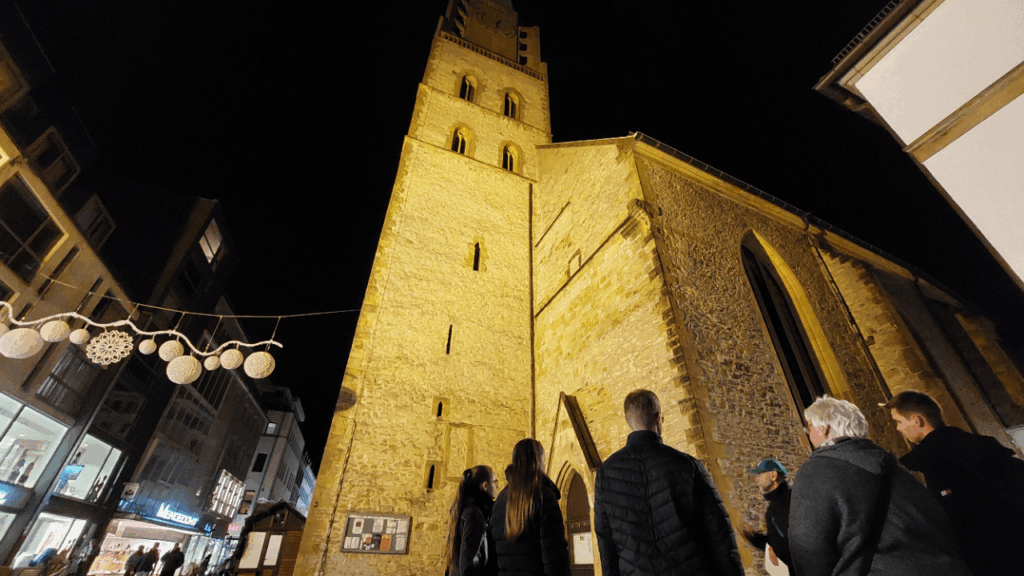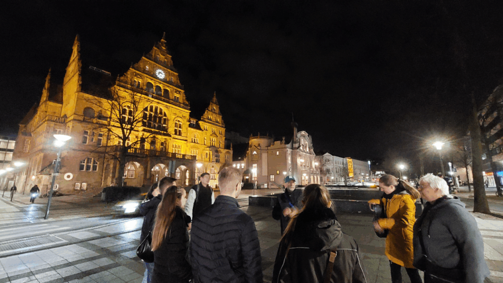 Am 11. November 2025 hatte der BDZ-Ortsverband Bielefeld seine Mitglieder zu einem kulinarischen Spaziergang durch die Bielefelder Altstadt -mit Stadtführung und Drei-Gänge-Menü- eingeladen. Um 17 Uhr begann die Stadtführung am Alten Rathaus, wo die Gruppe bereits einige interessante Informationen über das mittelalterliche Stadtbild in Bielefeld erhielt. Im „Hofbräu“ am Alten Rathaus gab es dann den ersten Gang – eine köstliche Maronenschaumsuppe, die so sicherlich die wenigsten der Teilnehmenden bisher gegessen hatten. Weiter ging es Richtung Altstädter Nikolaikirche, wo Wissenswertes über den Leineweber, den Leinenhandel und andere wichtige Industriezweige erläutert wurde. Es folgte der Hauptgang (Hacksteak und Backkartoffel mit Beilagen) im „Block House“. Der letzte Teil der Stadtführung führte die Gruppe dann in die westliche Altstadt, wo alle nochmals Eindrücke in die Bielefelder Kunstszene bekamen und einen Blick auf die Sparrenburg erhaschen konnten. Großen Eindruck hinterließen auch die Geldscheine aus Stoff, welche kunstvoll bedruckt früher als Zahlungsmittel eingesetzt wurden. Über den Klosterplatz ging es dann zur letzten Station des kulinarischen Rundgangs, ins „Kachelhaus“. Der knusprige und äußerst leckere Kaiserschmarrn und eine Tasse Kaffee waren dann ein gelungener Abschluss des Abends. Alle Teilnehmerinnen und Teilnehmer gingen satt und zufrieden nach Hause.