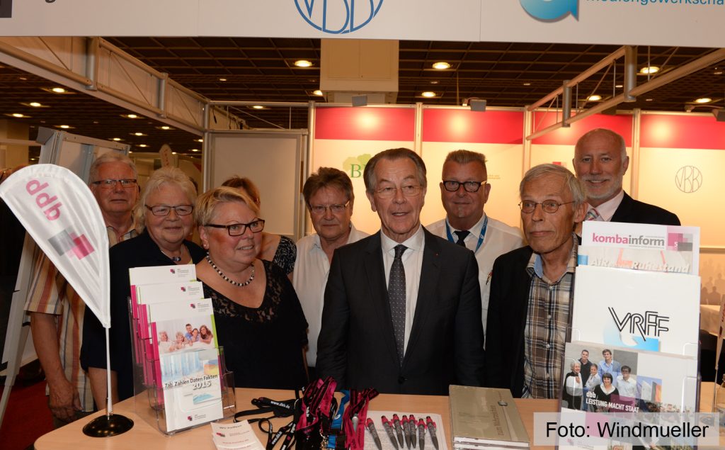 Bei diesem Info-Stand zeigte unter anderem der ehemalige Vizekanzler und Bundesminister Franz Müntefering (SPD) Interesse an der Seniorenarbeit des dbb und BDZ. Dieter Gentzsch, Mitglied des Ausschusses Ruhestand im Bezirksverband BMF, referierte auf einer der zahlreichen Veranstaltungen des 11. Deutschen Seniorentags über das Thema „Wohnen im Alter“.