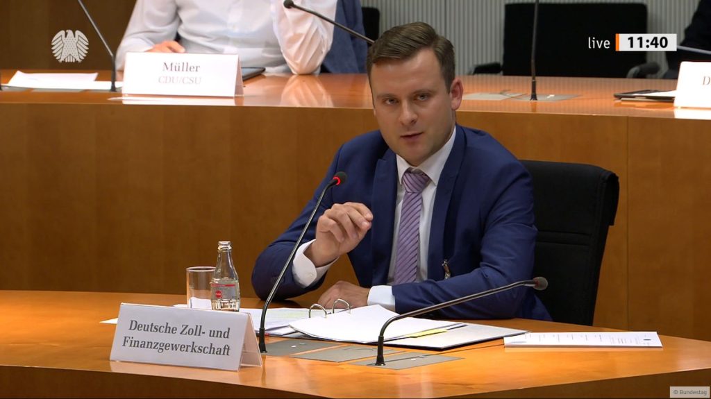 Bei der heutigen öffentlichen Anhörung des Finanzausschusses vertrat der stellv. BDZ Bundesvorsitzende Thomas Liebel als geladener Sachverständiger die Interessen der betroffenen Zöllnerinnen und Zöllner.
