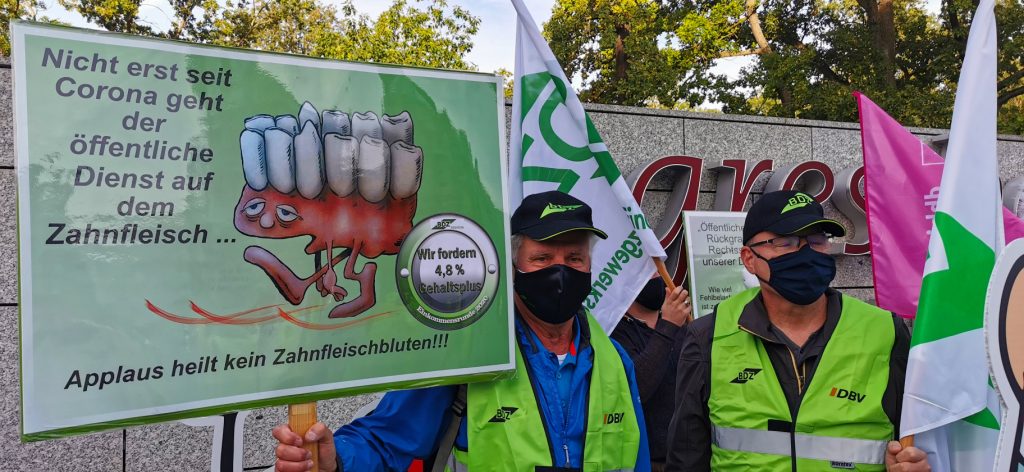 Die Arbeitgeberseite blieb auch in dieser Verhandlungsrunde bei ihrer Haltung, dass die enormen finanziellen Belastungen zur Bewältigung der Corona-Pandemie keinen Spielraum für die gewerkschaftlichen Forderungen lassen und forderten erneut einen Tarifabschluss mit äußerst geringem Umfang und extrem langer Laufzeit.