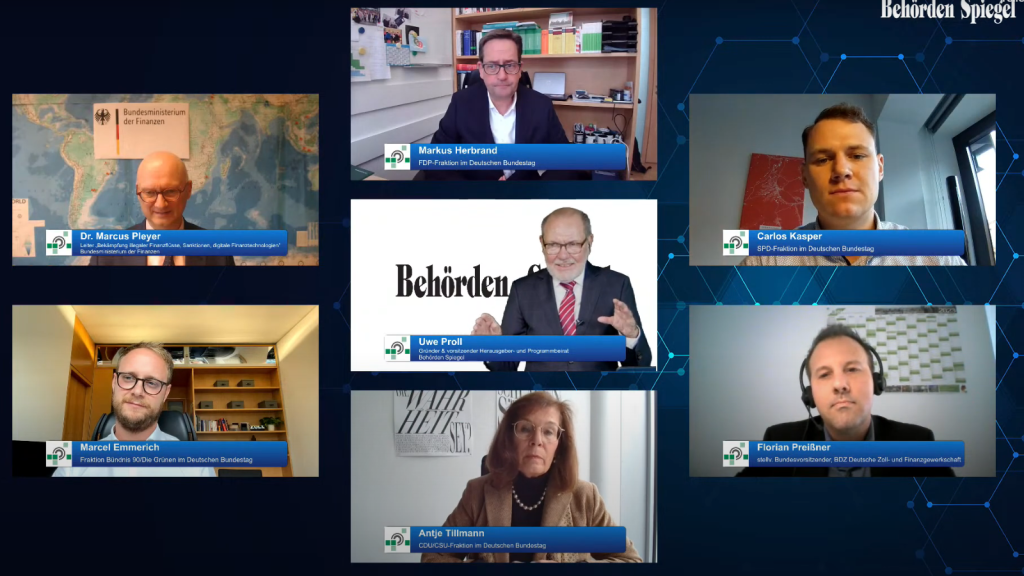 Zu diesen Themen und den damit verbundenen Herausforderungen sprachen am Digitalen Zolltag führende Vertreter der Verwaltung aus BMF, GZD und Ortsbehörden, unter anderem: Dr. Holle Jakob (Leiterin der Unterabteilung III A im BMF), Dr. Marcus Pleyer (Leiter der Unterabteilung VII A im BMF), Dr. Tino Igelmann (Direktionspräsident D VIII – Zollkriminalamt), Carolin Müller (Leitung ZFA Essen), Dr. Thomas Möller (Leitung HZA Osnabrück) und Daniel Thelesklaf (Leitung FIU).