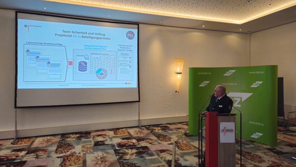 „Personalvertretung ist die DNA des BDZ“ – mit dieser Ansage begrüßte der BDZ-Bundesvorsitzenden Thomas Liebel die Anwesenden und stimmte auf die Veranstaltung ein. Im Anschluss eröffnete BDZ-Vize und Seminarleiter Florian Preißner die Konferenz. Direkt im Anschluss ging mit der „Zoll-Strategie 2030“ dann auch gleich um eines der zentralen Zukunftsprojekte der Zollverwaltung. Hochrangige Vertreter aus der Verwaltung, darunter Dr. Armin Rolfink (GZD-Präsident), Lars Bolte (GZD, Abteilungsleiter Direktion Digitales) und Dr. Holle Jakob (BMF, Unterabteilungsleiterin Abteilung III), werden die strategische Entwicklung des Zolls in den kommenden Jahren skizzieren.