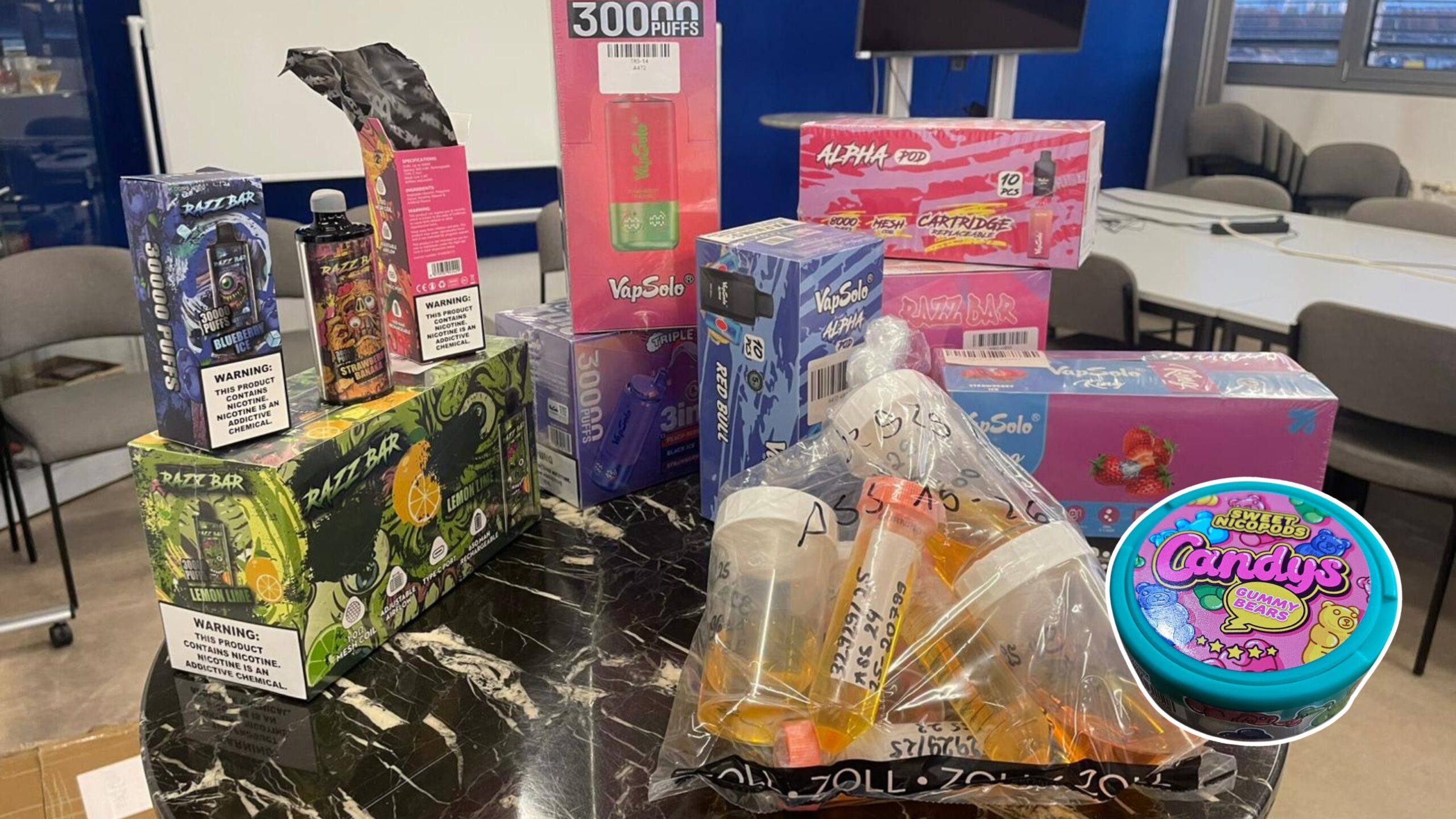 Die Aufmachung der Produkte richtet sich gezielt an Jugendliche - hier Sicherstellung der Zollfahndung Nürnberg, rechts hervorgehoben ein illegaler Nikotinbeutel (Pouch). Bild: BDZ